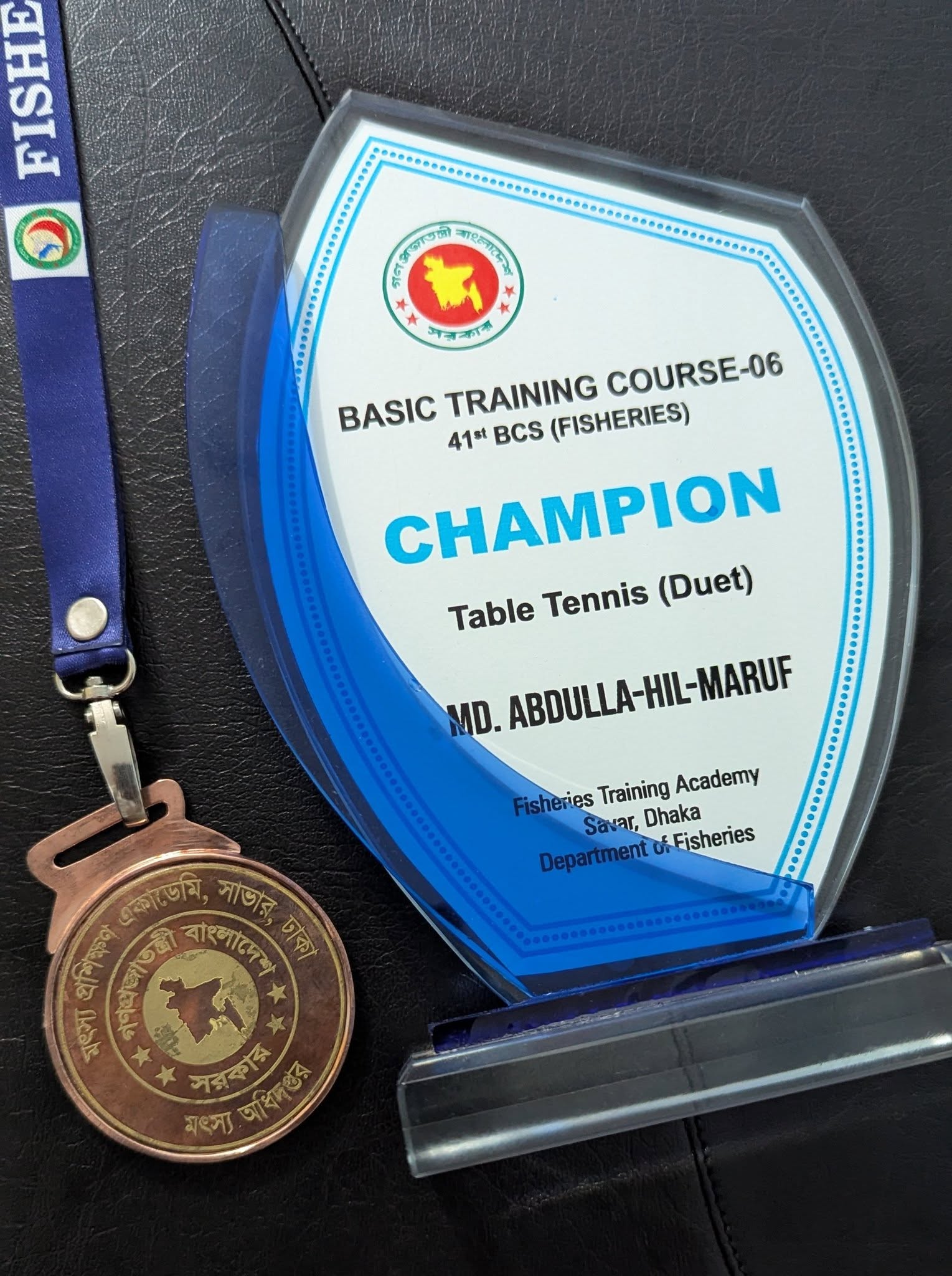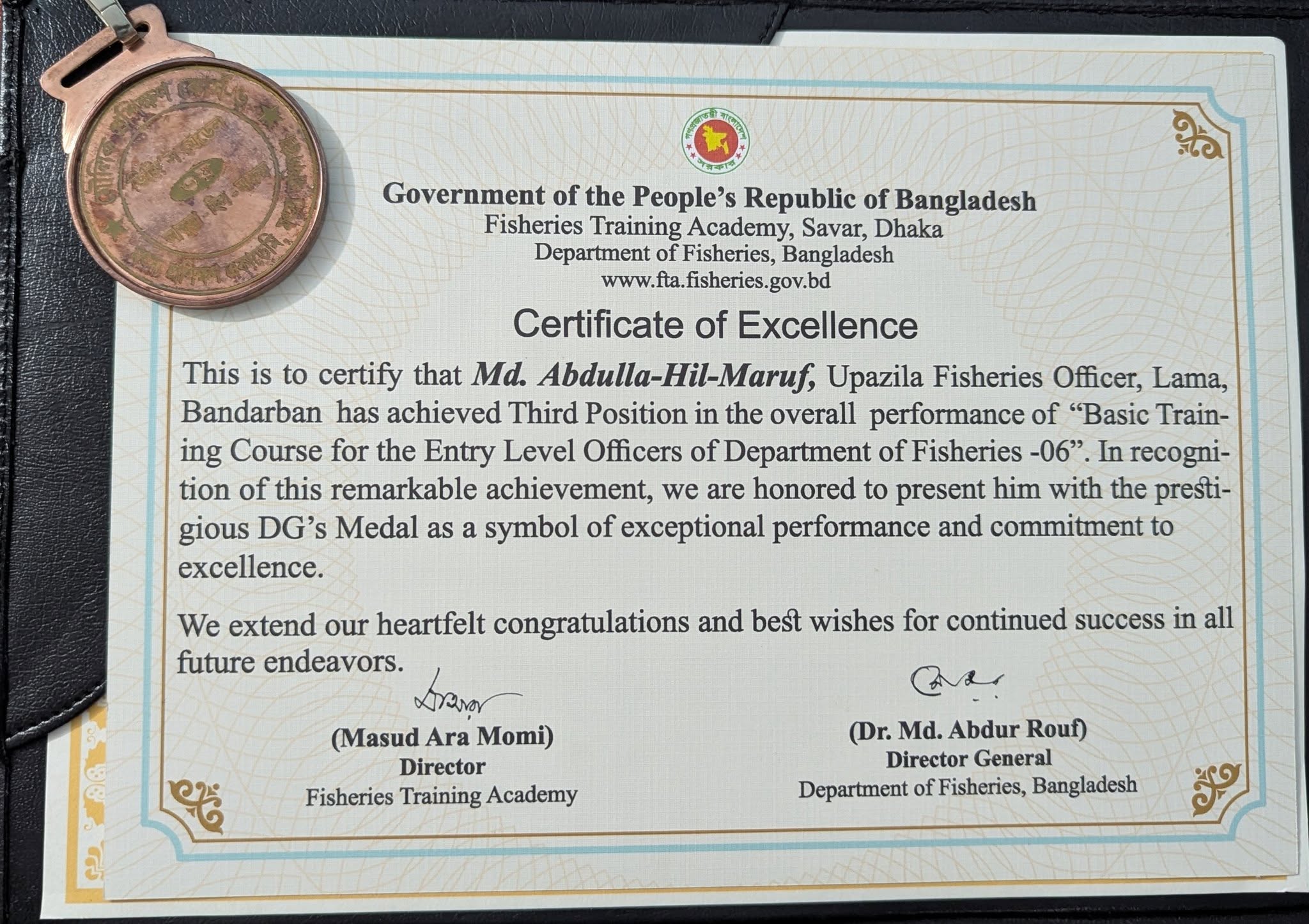 লামা উপজেলা মৎস্য কর্মকর্তা জনাব মো:আব্দুল্লা-হিল-মারুফ ঢাকা, সাভারে মৎস্য প্রশিক্ষণ ইনস্টিটিউটে অনুষ্ঠিত ৪১তম বিসিএস (মৎস্য) ক্যাডারদের এন্ট্রিলেভেল কর্মকর্তাদের মৌলিক প্রশিক্ষণ কোর্স-০৬ অংশ গ্রহণ করেন এবং প্রশিক্ষণ শেষে DG'S Medal অর্জন করায় উপজেলা মৎস্য অফিস, লামার পক্ষ থেকে অভিনন্দন।